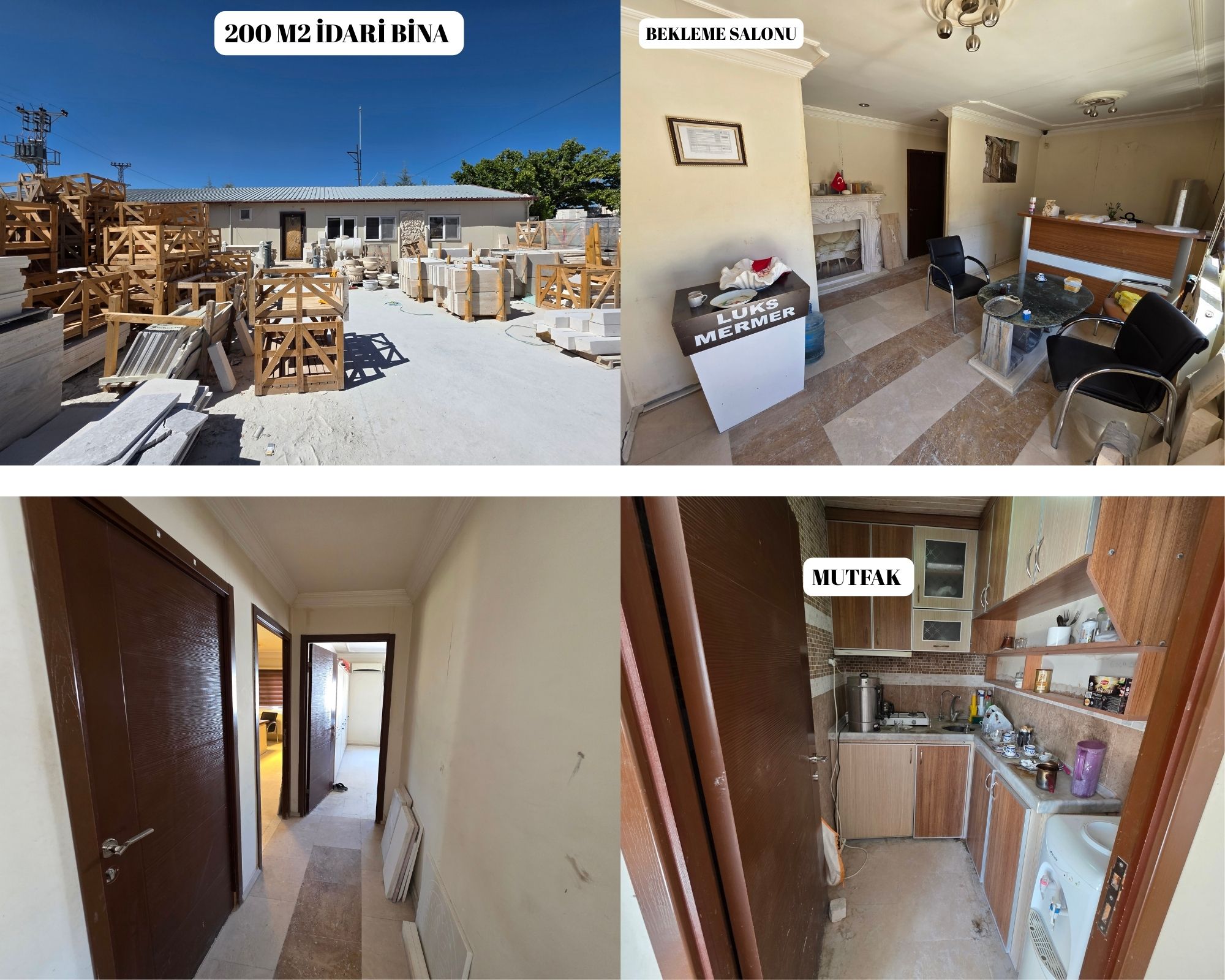 İDARİ BİNASINDA BEKLEME SALONU MUTFAK 2 TANE TUVALETİ VE 4 TANE OFİSİ VARDIR.